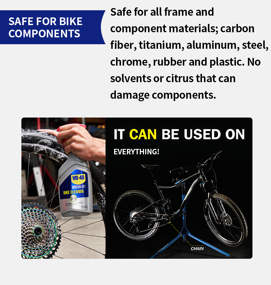 Spray to help dissolve tough grease and grime on the bike, not forgetting the underside of the frame and fork where the heaviest gunk resides. Safe for all bike surfaces including carbon fiber, titanium, aluminum, steel, chrome, rubber and plastic.