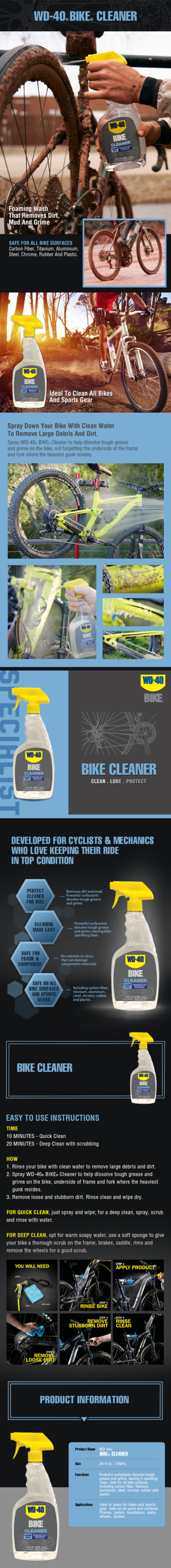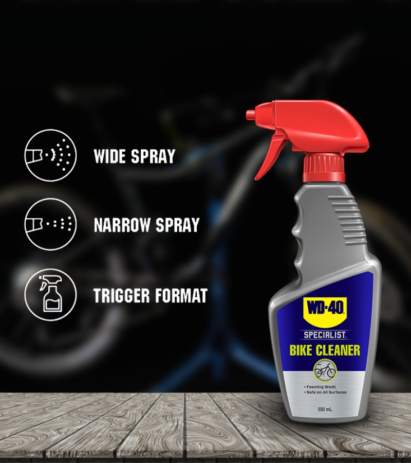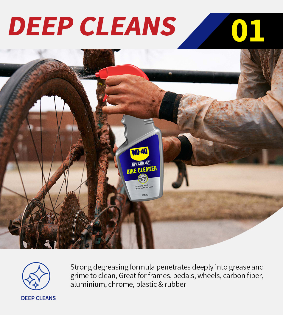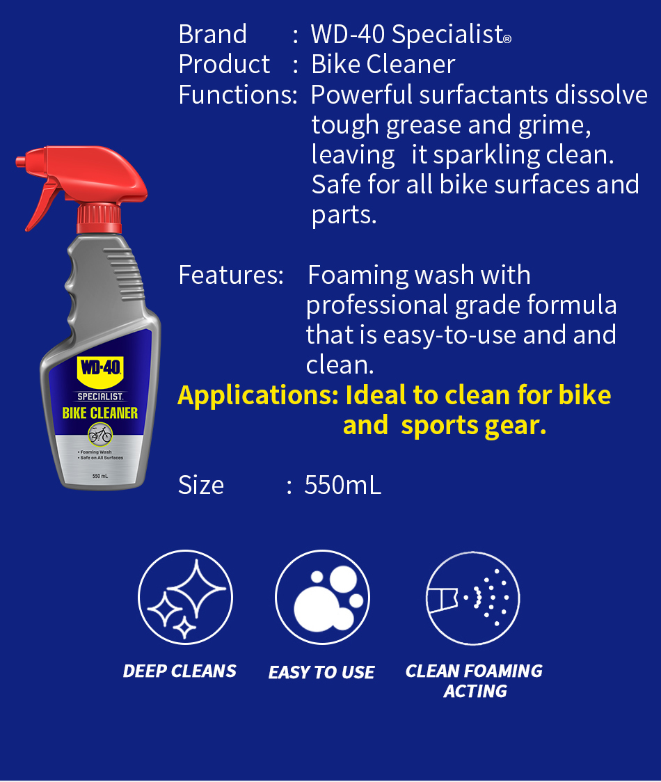 WD-40 Specialist® Bike Cleaner is a biodegradable foaming wash that is easy-to-use and safe on all parts and surfaces. Experience the difference of a professional-grade formula that is powerful enough to help remove embedded grease and grime to prevent component wear, damage and surface scratching. Developed for cyclists and mechanics who love keeping their ride in top condition.