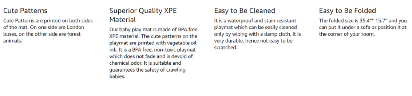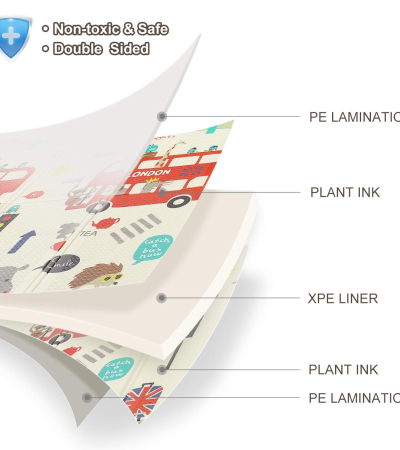 • Superior Quality XPE Material: Our baby play mat is made of BPA free XPE material. The cute patterns on playmat are printed with vegetable oil ink. The product is characterized by the following features; BPA free, non-toxic, no-fading, no chemical odor, comfortable and safe for baby crawling. This is a toddler-friendly mat that guarantees the safety of your baby.
