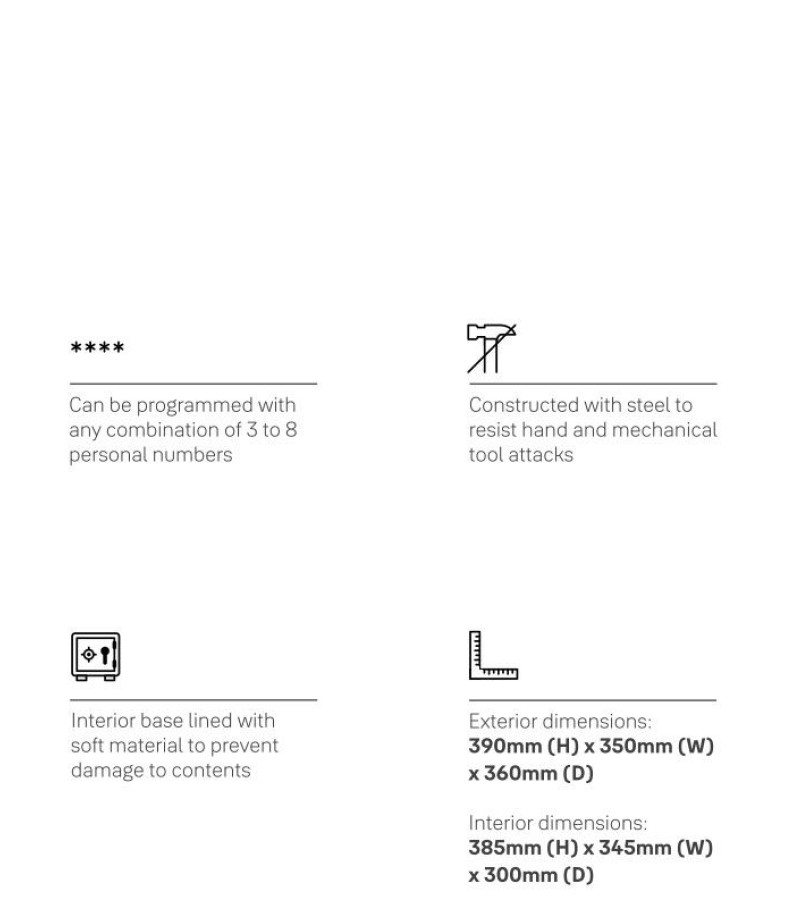 Bring the Yale 41 Litres Digital Safety Locker which helps in protecting the things that matter the most to you. Equipped with 41 litres capacity, it will keep your most important belongings secured. Designed with a strong steel body and 16 mm secure bolts and with a pin code, you are able to gain quick access to your safe. Also, the steel construction with carpeted floor helps to protect against scratches and damages. The Yale 41 Litres Digital Safety Locker nicely accommodates a wide range of items, including legal documents, passports, jewellery, cash, and more. Whether that’s your camera to capture those special moments or a sentimental belonging, this can be the ideal locker you are searching for. The Yale 41 Litres Digital Safety Locker is convenient to operate having a digital keypad with LCD display and a programmable combination of 3 to 8 digits. The electronic lock and digital pin access offer quick set-up and easy operation. Inputting the incorrect code 4 times sounds an internal alarm for 3 minutes and locks out the code pad for that time. It uses 4 AA size batteries (1.5 Volt). In case of battery failure, the safe can be operated with a manual override function with 2 security override keys supplied. It comes with pre-drilled holes (fixing bolts supplied) which allows permanent mounting to floors, walls, or most hard surfaces for additional security.