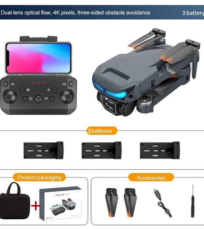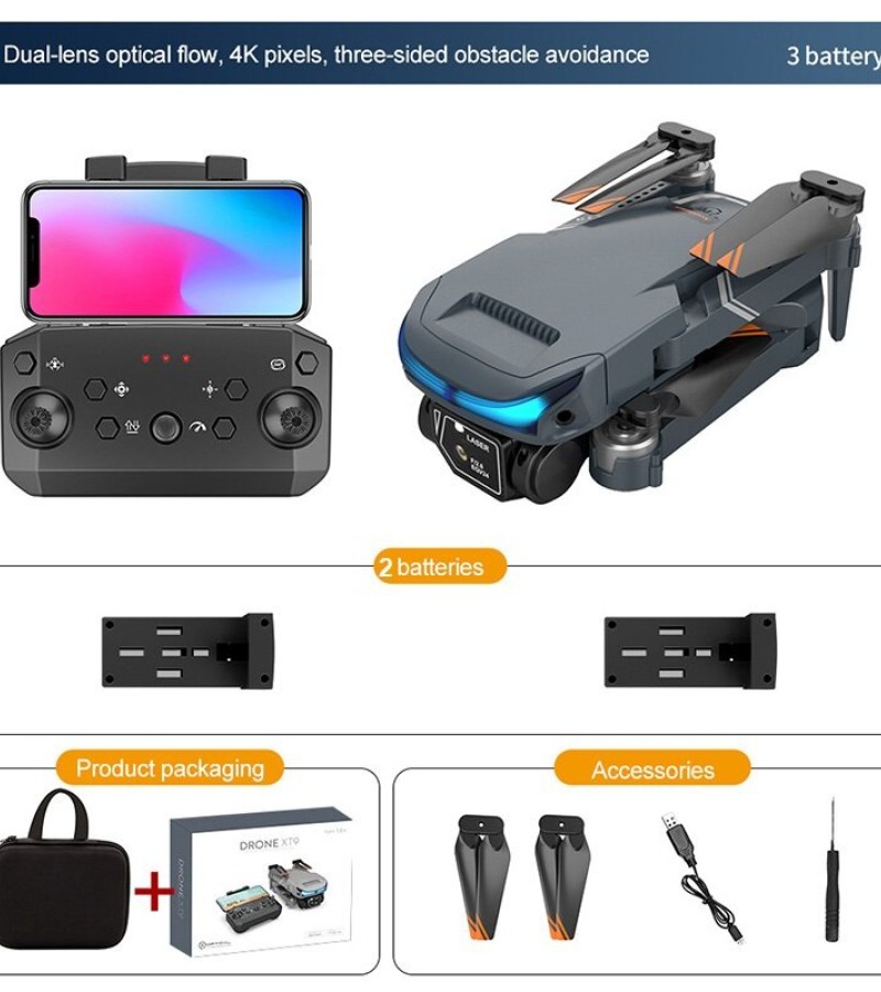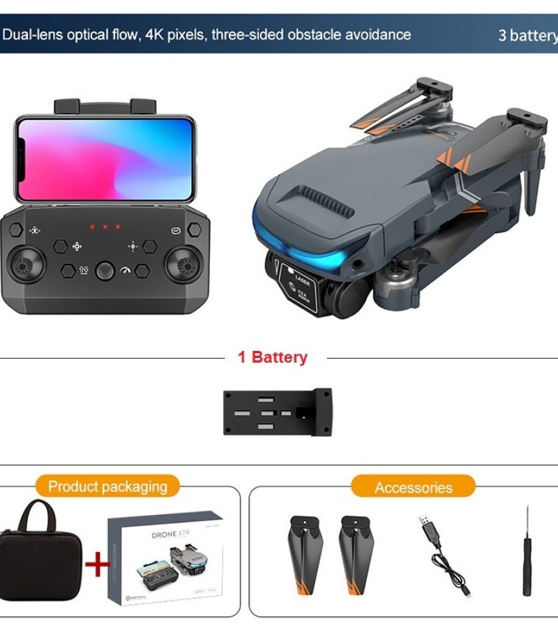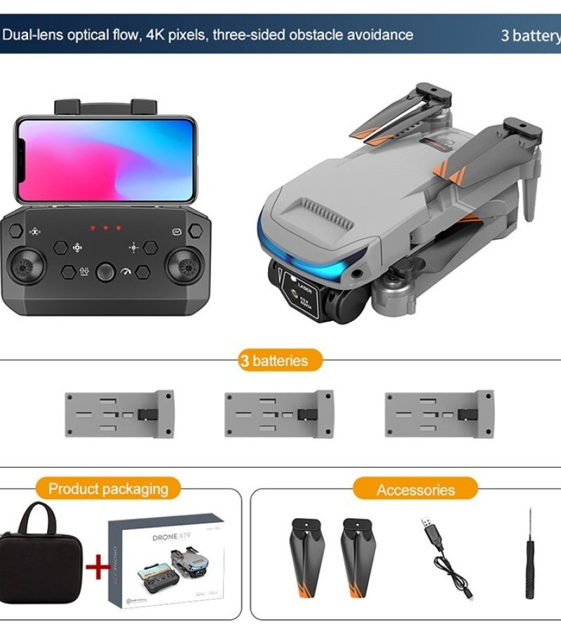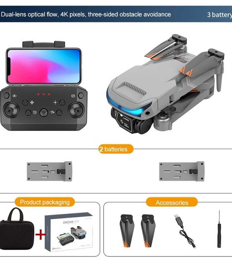 XT9 Drone Description: Product Name: XT9 drone with 4K HD Dual Camera Item NO.: XT9 Material: ABS Plastic & Electronic Components Color: Black Gyro: 6-axis Frequency: 2.4G Channel: 4CH Motor: 716 Brushed Coreless Motor Battery: 3.7V 1800MAH Lipo Battery (Included) Transmitter Power: 3 x AAA Battery (Not Included) Transmitter Mode: Mode 2 (Left Hand Throttle) Flying Time: about 15mins Low Flying Speed: 2m/s Medium Flying Speed: 4m/s High Flying Speed: 7m/s Charging Time: 120 minutes RC Distance: 80-100m FPV Distance: 30m FPV: WiFi Camera:4KDual Camera Resolution: 4K Camera Angle: Electric regulation Adjustable 180°- 90° Quadcopter Size: 18*12.5*4.5CM (Unfolded) 13*7*4CM (Folded) Package Weight: 460g Package Size(BOX): 22.5*17.5*7 CM