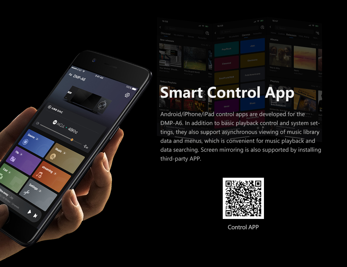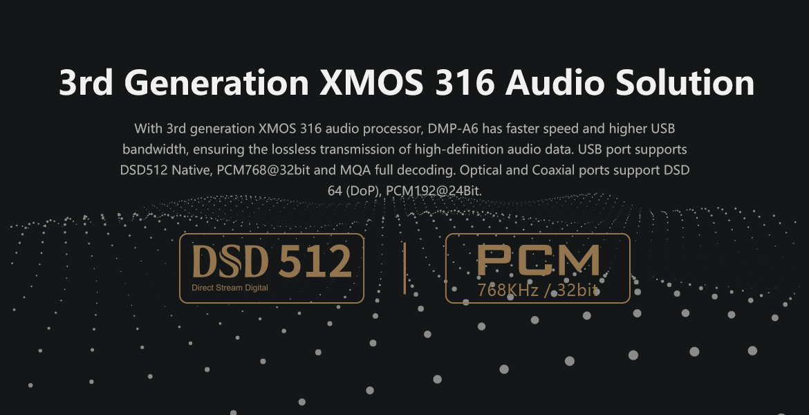 > Support DSD512 Native, PCM768KHz@32Bit, MQA full decoding.