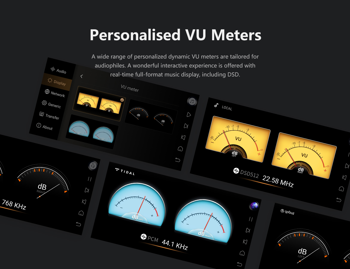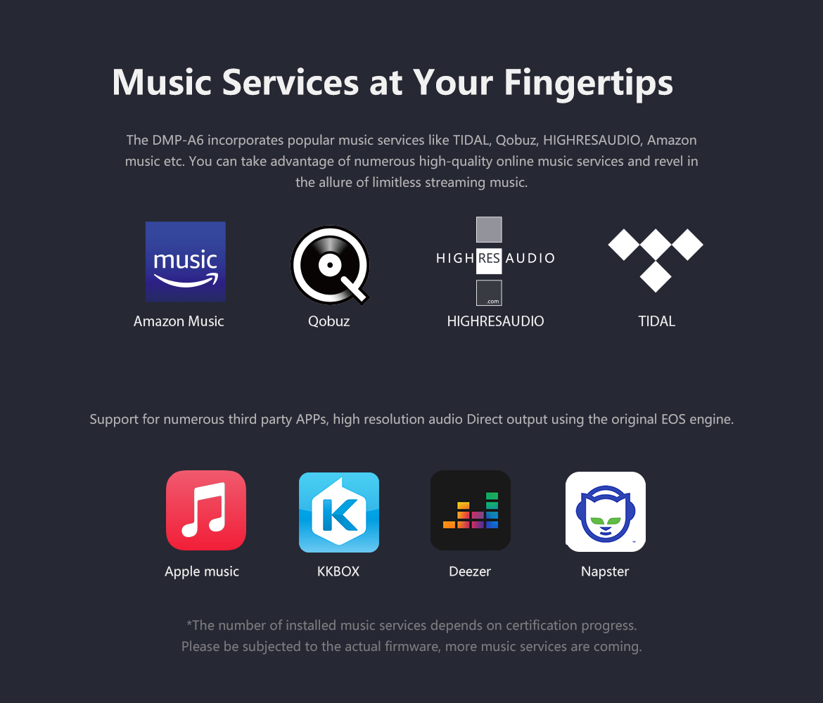 > Music Service: Tidal, Qobuz, Highresaudio, Amazon, WebDAV, UPnP