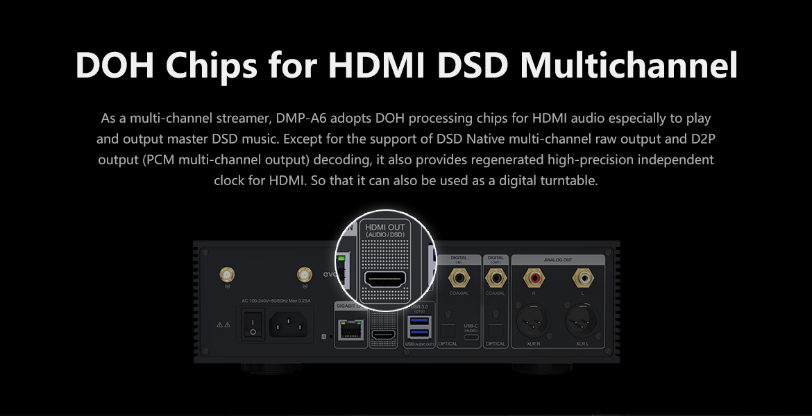 > 2x DOH chips, support HDMI DSD Native and D2P multi-channel output(Up to 5.1).