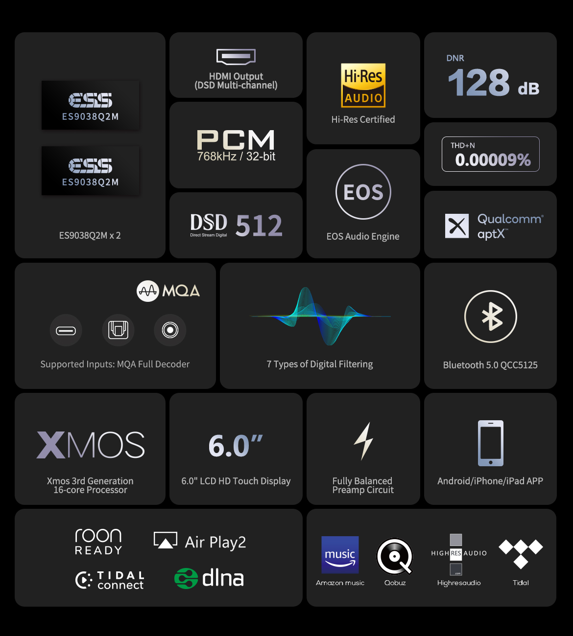 > Playback and DAC Decoding: Support up to stereo DSD512, PCM 768KHz 32Bit, MQA