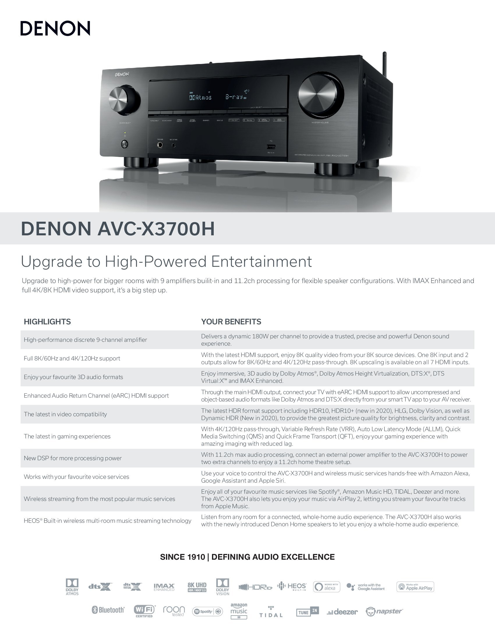 Denon's AVR-X3700H helps deliverexciting home theater soundfor movies and TV shows, video games, and music.